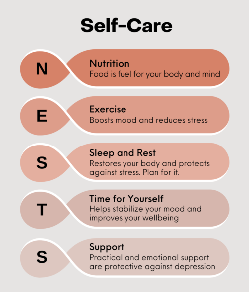 Self-care is key to protecting your overall health and well-being. It may help protect against depression and anxiety as well as help to treat it. Remembering the term NESTS can help you recall the basic steps of self-care to reduce stress and make you feel better: